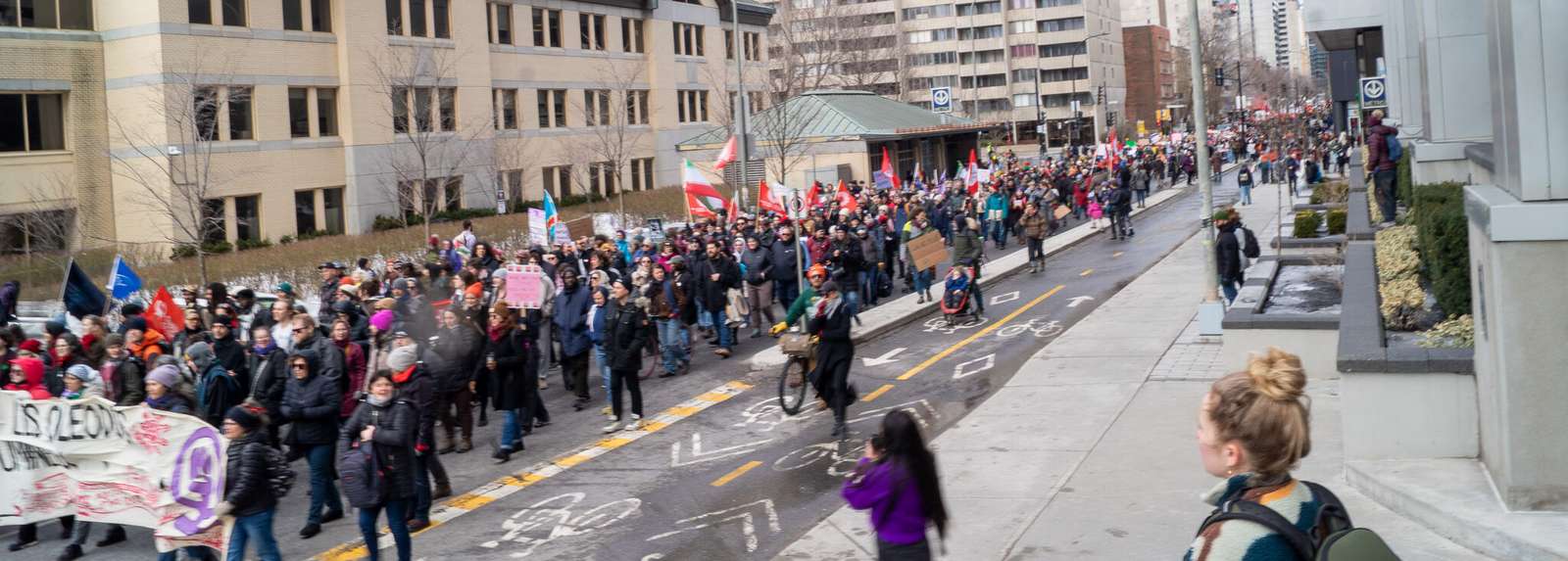 Elles dénoncent également le projet de loi 9 du gouvernement provincial, interdisant le voile pour les professeurs de confession musulmanes sous couvert de la laïcité, ainsi que l’énorme diminution du financement du communautaire, un autre milieu de travail majoritairement féminin.